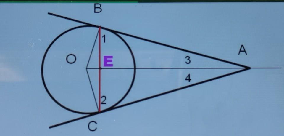 ΔАВЕ=ΔАСЕ (АЕ - общая сторона; АВ=АС по свойству касательных, проведенных к окружности из одной точки; ∠1=∠2 как углы при основании равнобедренного треугольника)