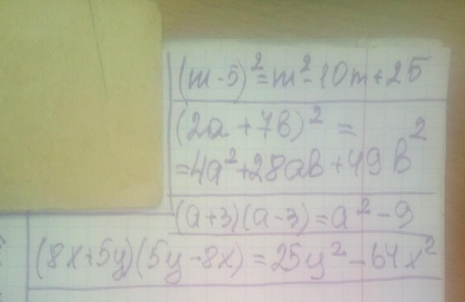 Представьте в виде многочлена: 1)(m-5)²; 2)(2a+7b)²; 3)(a+3)(a-3); 4)(8x+5y)(5y-8x).