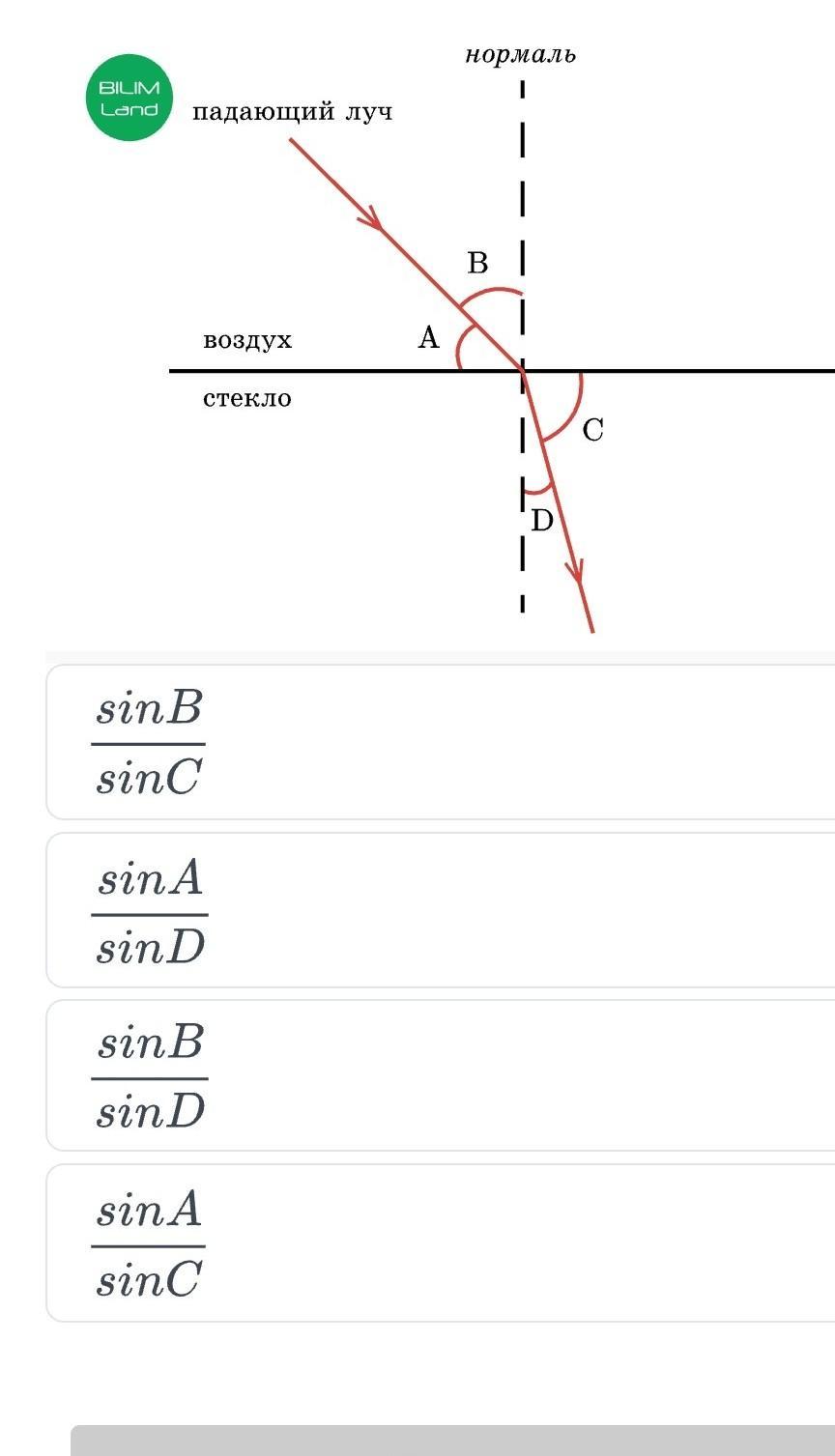 на рисунке показано преломление световых лучей при переходе из воздуха в стекло. какое из следующих соотношений можно использовать для правильного определения показателя преломления?