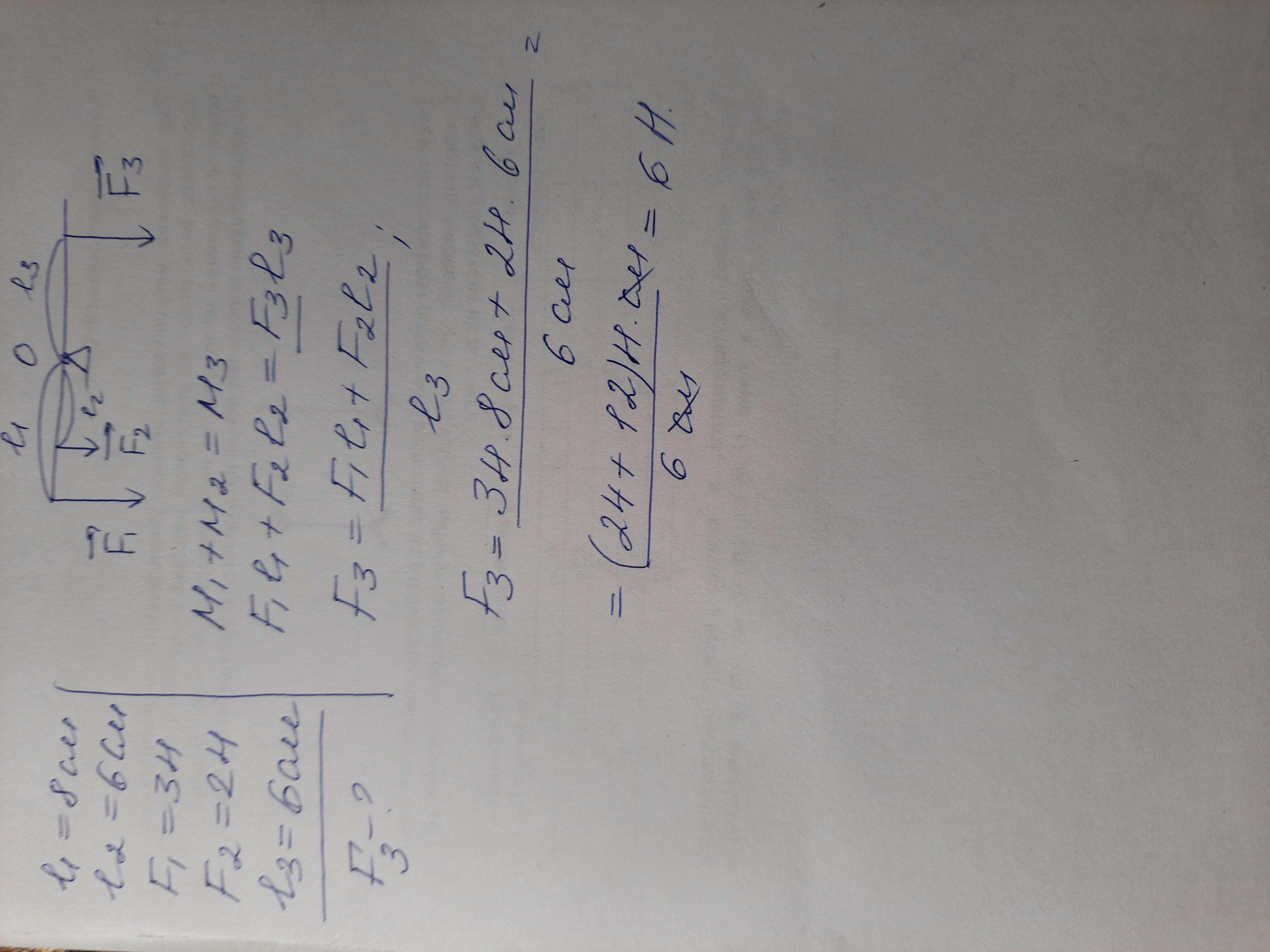 На левое плечо рычага действуют силы 3 Н и 2 Н. Плечи сил соответственно равны 8 см
