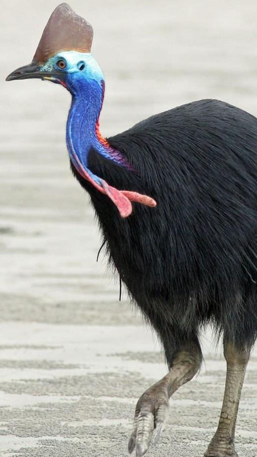 Внешне казуары довольно эффектны: черное перо, роговой гребень на голове и ярко- красная шея. Шлем на голове казуар использует для раздвижения веток, когда идет по лесу. Пускает его и в случае драки с соперником. Возможно яркая окраска предупреждает соперников об опасности казуаров, эта птица агрессивная и нападает без предупреждения