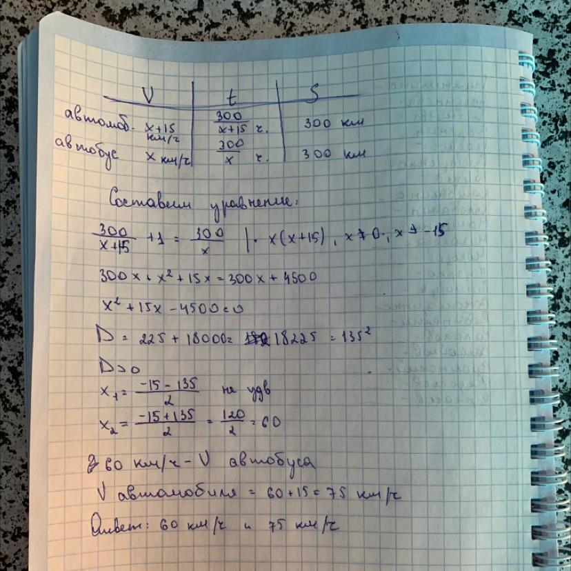 Из одного города в другой, расстояние между которыми равно 300 км, выехали одновременно автобус и автомобиль.Автобус двигался со скоростью на 15 км/ч меньше, чем автомобиль и прибыл в пункт назначения на 1 ч позже автомобиля.Найдите скорость автомобиля и скорость автобуса