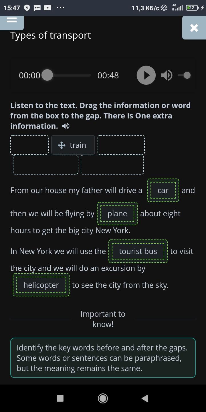 Listen to the text. Drag the information or word from the box to the gap. There is One extra information. )