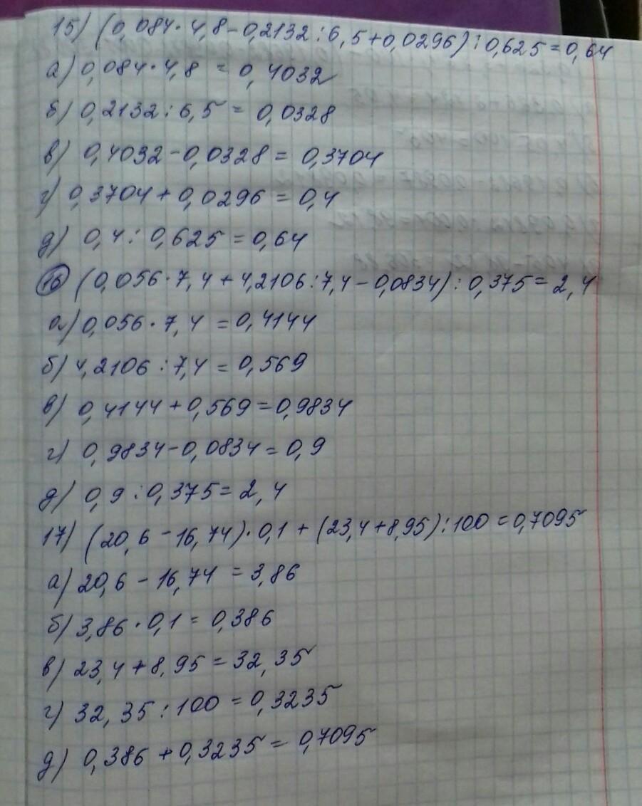 15) (0,084 · 4,8 -0,2132 : 6,5 + 0,0296): 0,625;