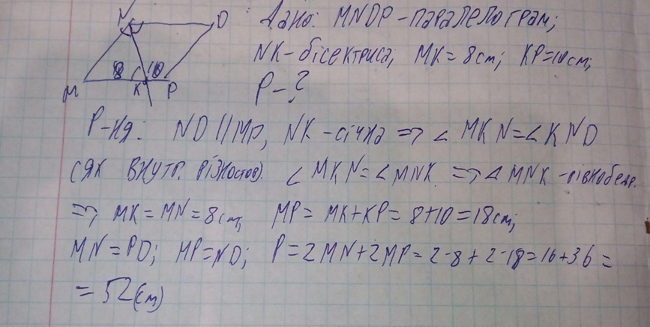 Бісектриса топого кута паралелограма MNDP поділяє сторону MP на відрізки 8 см і 10см, рахуючи від вершини гострого кута. Знайди периметр паралелограма.
