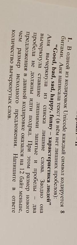 Если мы удаляем какое то слово, то вместе с ним удаляется 1 запятая и 1 пробел. Т.к. каждый символ кодируется 1 байтом и размер текста изменился на 12 байт, то наше слово состоит из 10 букв (12 символов всего, из них 1 запятая и 1 пробел). Как мы видим, слова из 10 букв у нас здесь нет. Значит удалили не 1 слово. Если удалили 2 слова, то у нас так же пропали 2 запятые и 2 пробела, значит из 12 изначальных символов, на слова осталось 8. Мы видим, что можно найти два слова, сумма символов которых будет равна 8. Например: sad и happy или bad и happy. Нас спрашивают, сколько слов удалили? Ответ - 2