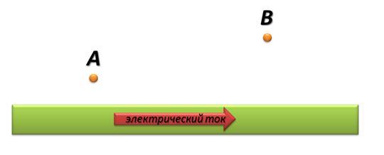 Обрати внимание, что точки A и B находятся обе сверху от проводника, но на разном расстоянии от него.