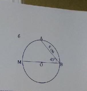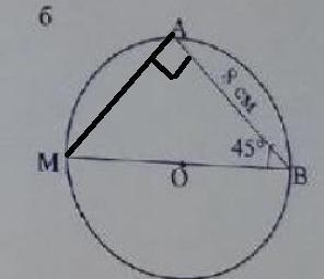 достроим MA, треугольник MAB - прямоугольный и равнобедренный, т.к. угол MAB опирается на диаметр, то он равен 90 градусов. Из треугольника MAB, MA=AB=8, т.к. треугольник равнобедренный, по т. пифагора =