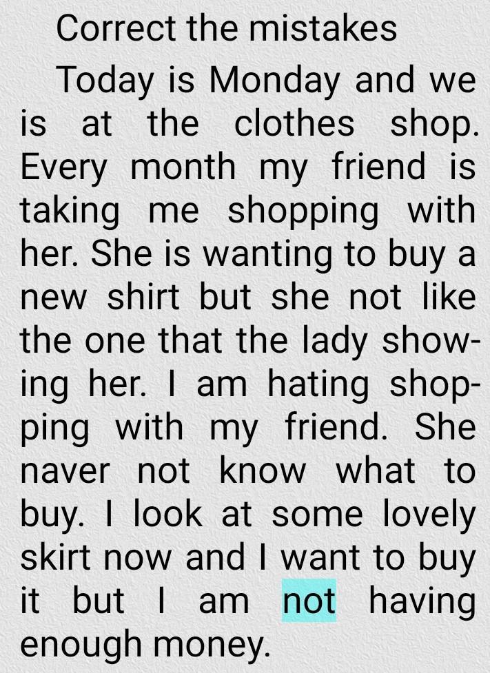 Today is Monday and we are at the clothes shop. Every month my friend takes me shopping with her. She is waiting to buy a new shirt, but she does not like the one that the lady is showing her. I hate shopping with my friend. She never knows what to buy. I am looking at a lovely skirt now and I want to buy it, but i do not have enough money.