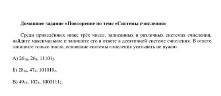 Домашнее задание «Повторение по теме «Системы счисления» Среди приведённых ниже трёх чисел, записанных в различных системах счисления, найдите максимальное и запишите его в ответе в десятичной системе счисления. В ответе запишите только число, основание системы счисления не нужно. A) 26, 11101, Б) 28… 47… 101010 B) 4916, 102,, 1000111