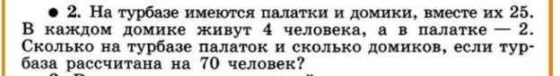 Так как в каждом домике живут 4 человека, а в палатке 2, а всего их 70, то будет верным следующее уравнение: