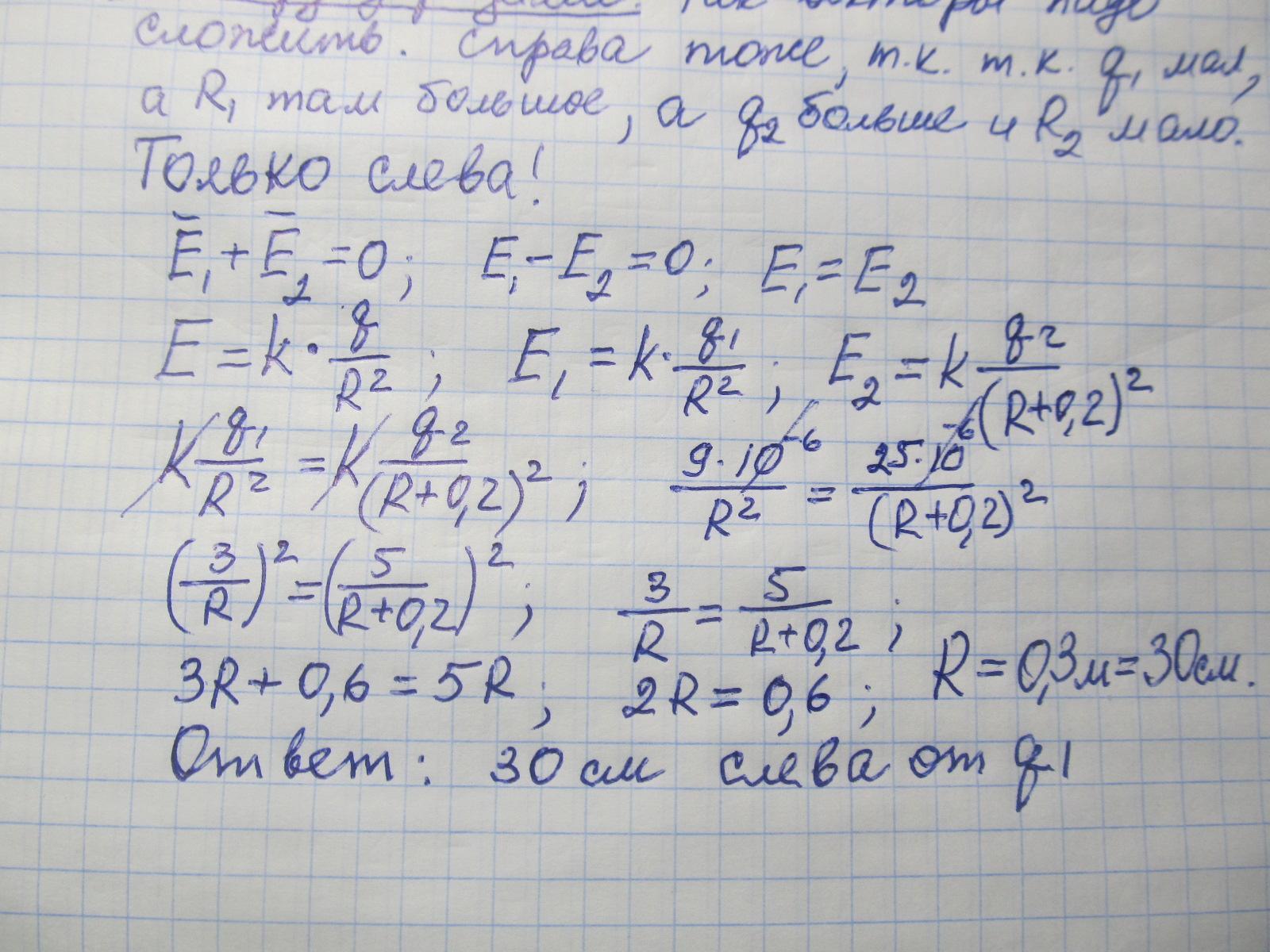 Разберись, почему точка не может быть между зарядами и справа. Между, т.к. векторы не могут дать в сумме 0. А справа, хоть и направлены в разные стороны, но не равны по величине. Проанализируй формулу. Е1 гораздо меньше Е2.