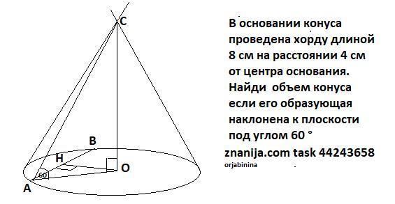 В основании конуса проведена хорду длиной 8 см на расстоянии 4 см от центра основания. Найди объем конуса если его образующая наклонена к плоскости под углом 60 °