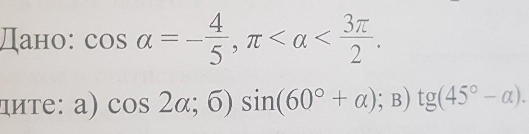 cos α = -4/5 = -0.8; π < α < 3π/2 (3-я четверть)