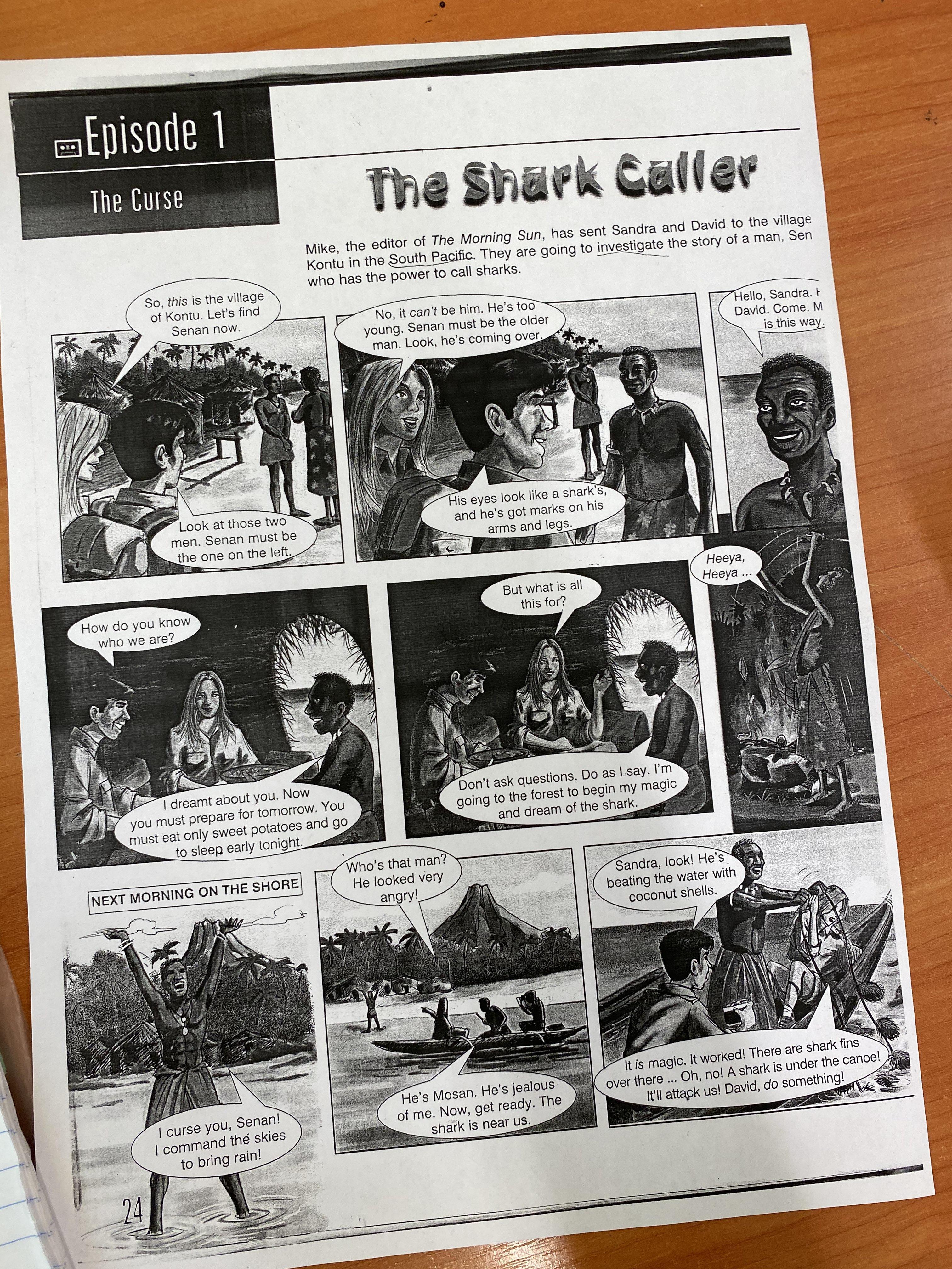 Sandra took the paddle and started to beat the shark. Two minutes later the Shark has been weird: he breathe very hard and swam across the sea, and died. David bring with him the knife, and killed the shark inside his stomach