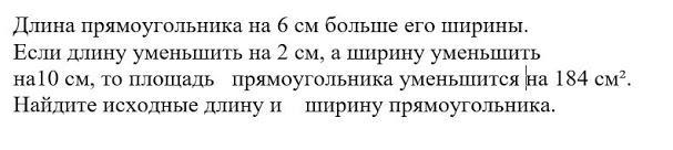 Площадь нового прямоугольника равна S₁=(x-10)(x+4) , S₁= S-184 .