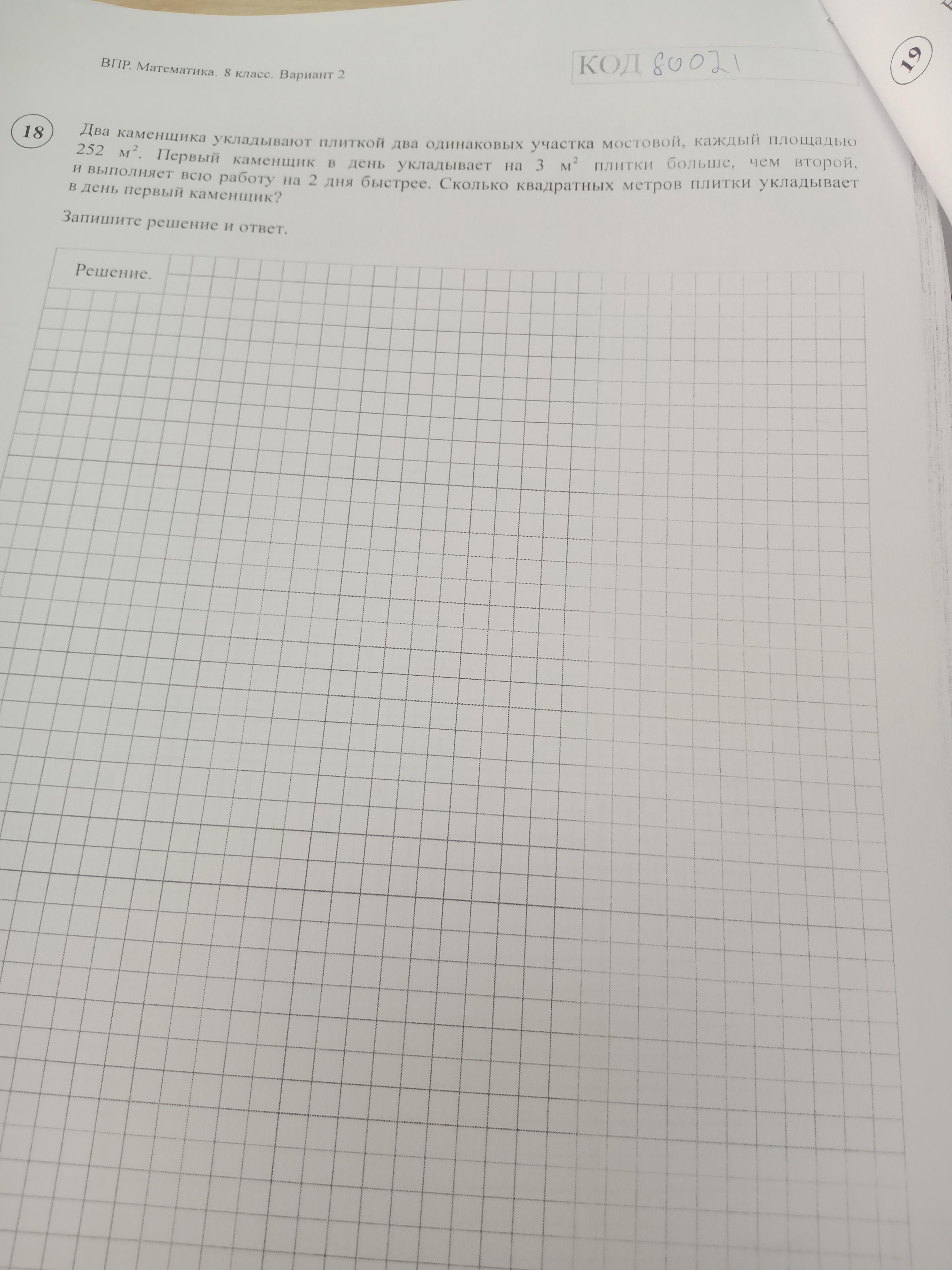 Тогда 1 каменщик укладывает (х+3) м² в день и работает (t-2) дня . Площадь участка, который выложит каменщик, равна (х+3)(t-2)=252 м² .