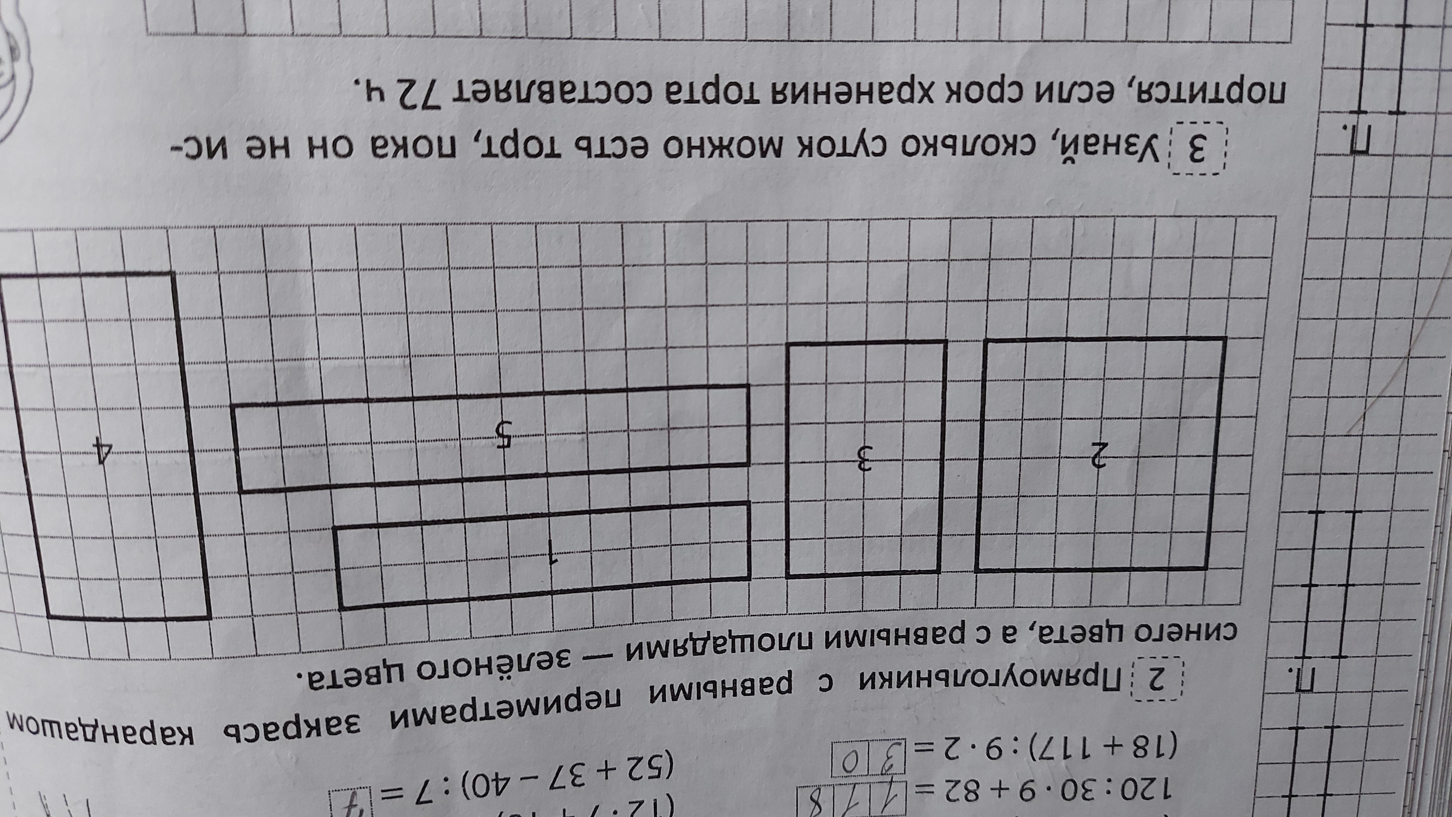 Прямоугольники с равными периметрами закрась карандашом синего цвета, а с равными площядями --зёленого цвета.