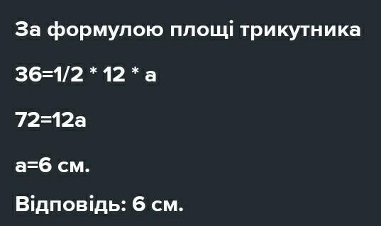 площа трикутника 36см²,а одна з його висот 8см,знайдіть довжину сторони,до якої проведено цю висоту