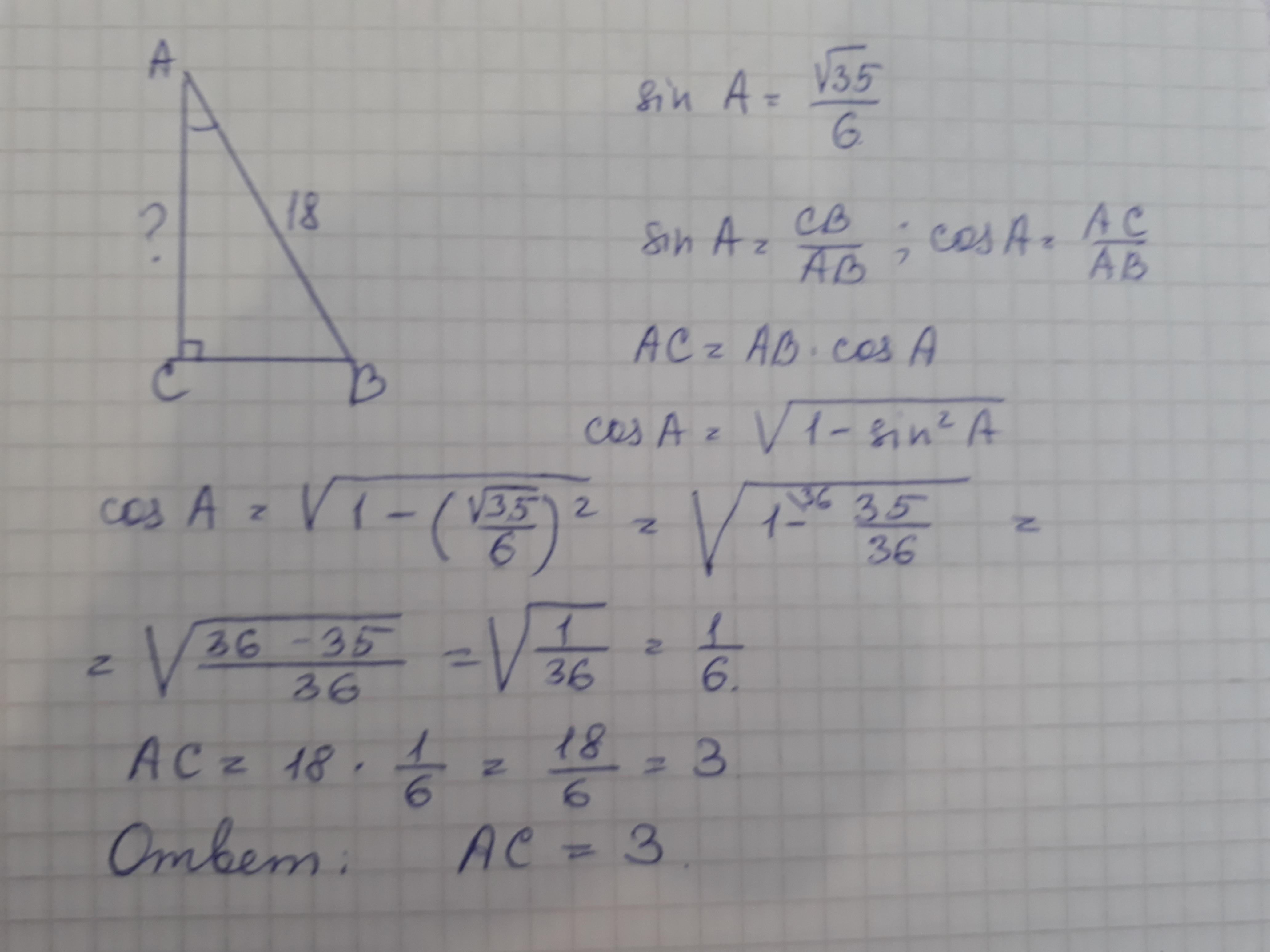 в треугольнике ABC угол C равен 90°, AB=18, sin A= √35/6. найдите длину стороны AC