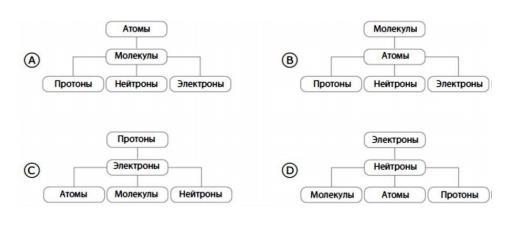 Какая из диаграмм лучше всего отображает строение вещества,начиная от самых сложных частиц вверху и заканчивая элементарными частицами внизу?