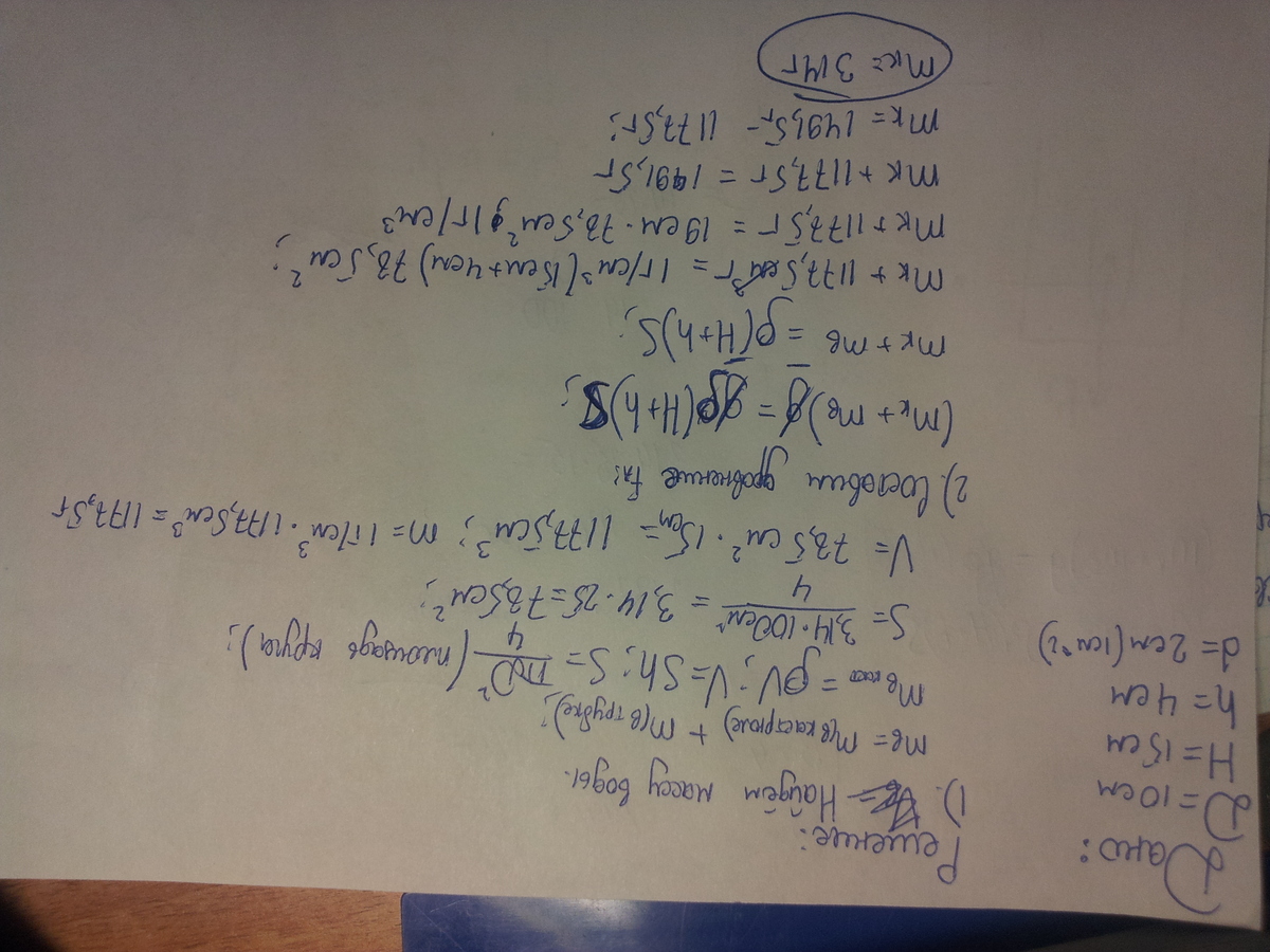 на горизонтальном листе резины лежит перевёрнутая кастрюля радиусом 10 см и высотой н=15 см в дне кастрюли просверлено круглое отверстие радиусом 1 см в которое плотно вставлена лёгкая вертикальная трубка в кастрюлю через трубку наливают воду когда вада заполняет всю кастрюлю и поднимается по трубке на высоту h=4см она начинает вытекать из под краёв кастрюли какова масса кастрюли?