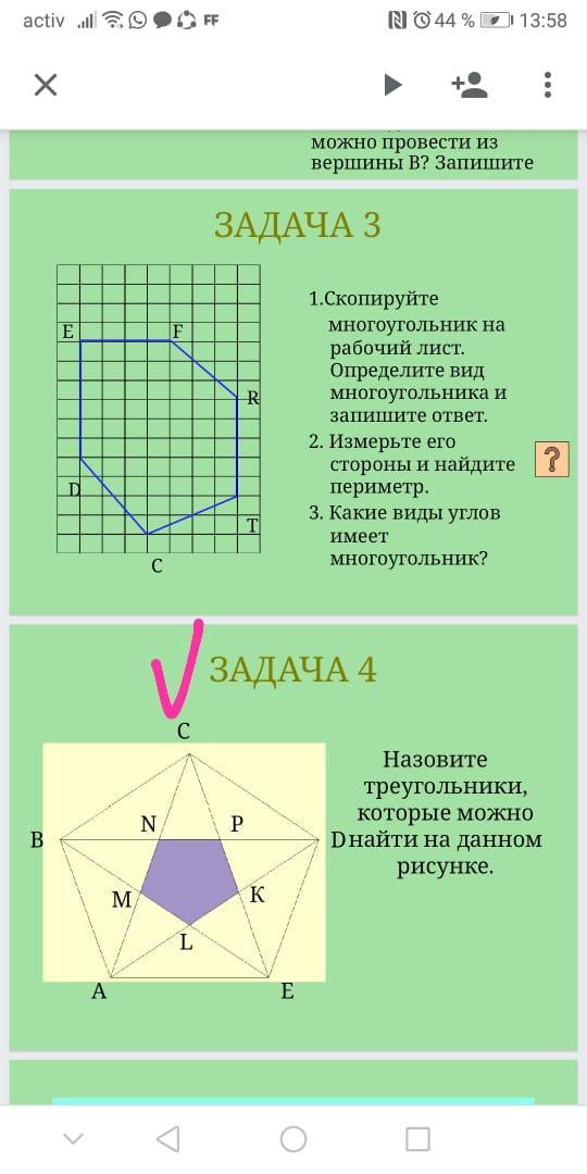 1.Скопируйте многоугольник на рабочий лист. Определите вид многоугольника и запишите ответ. 2. Измерьте его стороны и найдите периметр. 3. Какие виды углов имеет многоугольник?