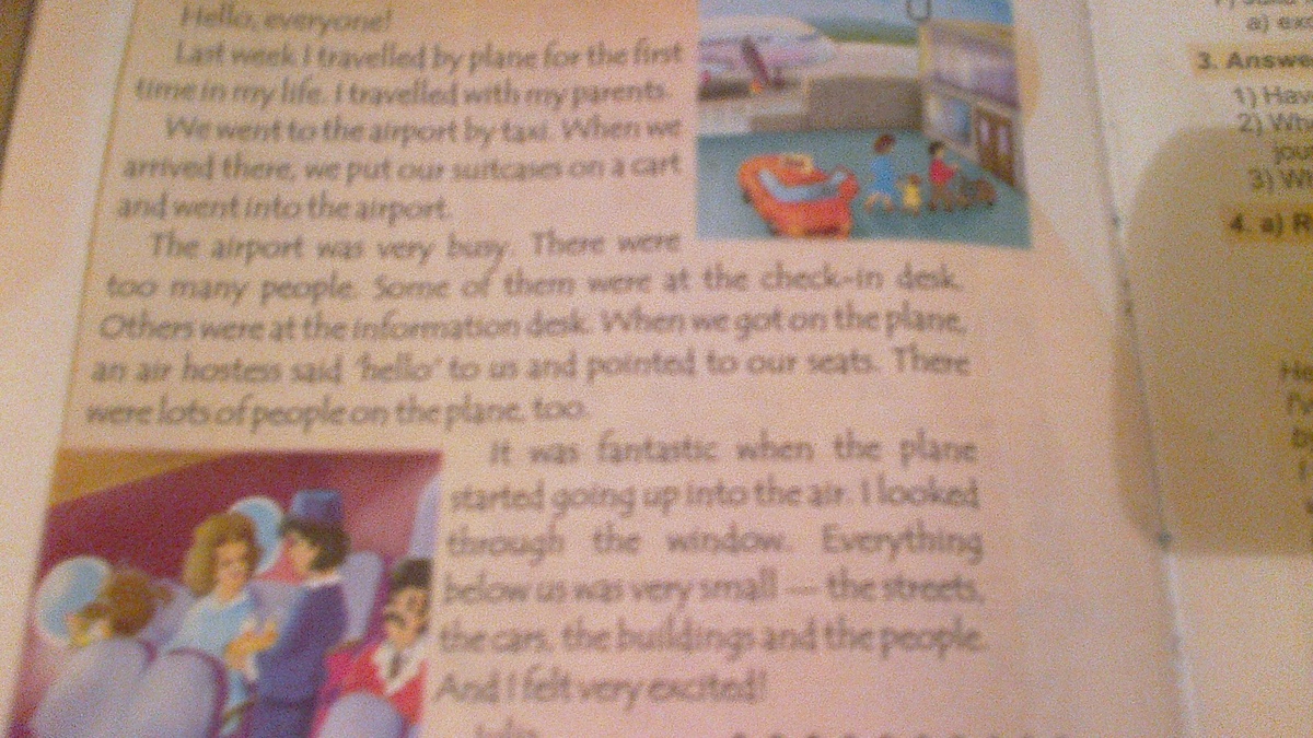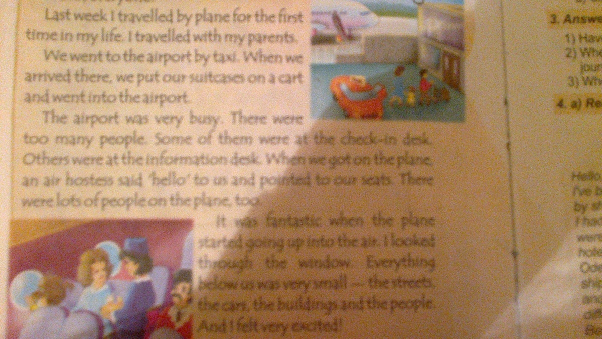 Аэропорт был очень оживленный. Там было также много людей. Некоторые были у столов регистрации. другие - у столов информации. Когда мы пришли в самолет, стюардесса сказала хелло нам и указала наши места. В самолете было множество народа также.