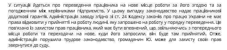 Громадянин Ю. працював викладачем бухгалтерського обліку у торгово- економічному інституті. На запрошення керівництва заводу „Електрон” він вирішив перейти на завод на посаду старшого економіста. Перехід на завод за погодженням з адміністрацією інституту проводився у порядку переведення. Але коли Ю. звільнився з інституту та прийшов до відділу кадрів заводу, йому було відмовлено в прийнятті на роботу. Як пояснив директор заводу, за час оформлення переводу було знайдено