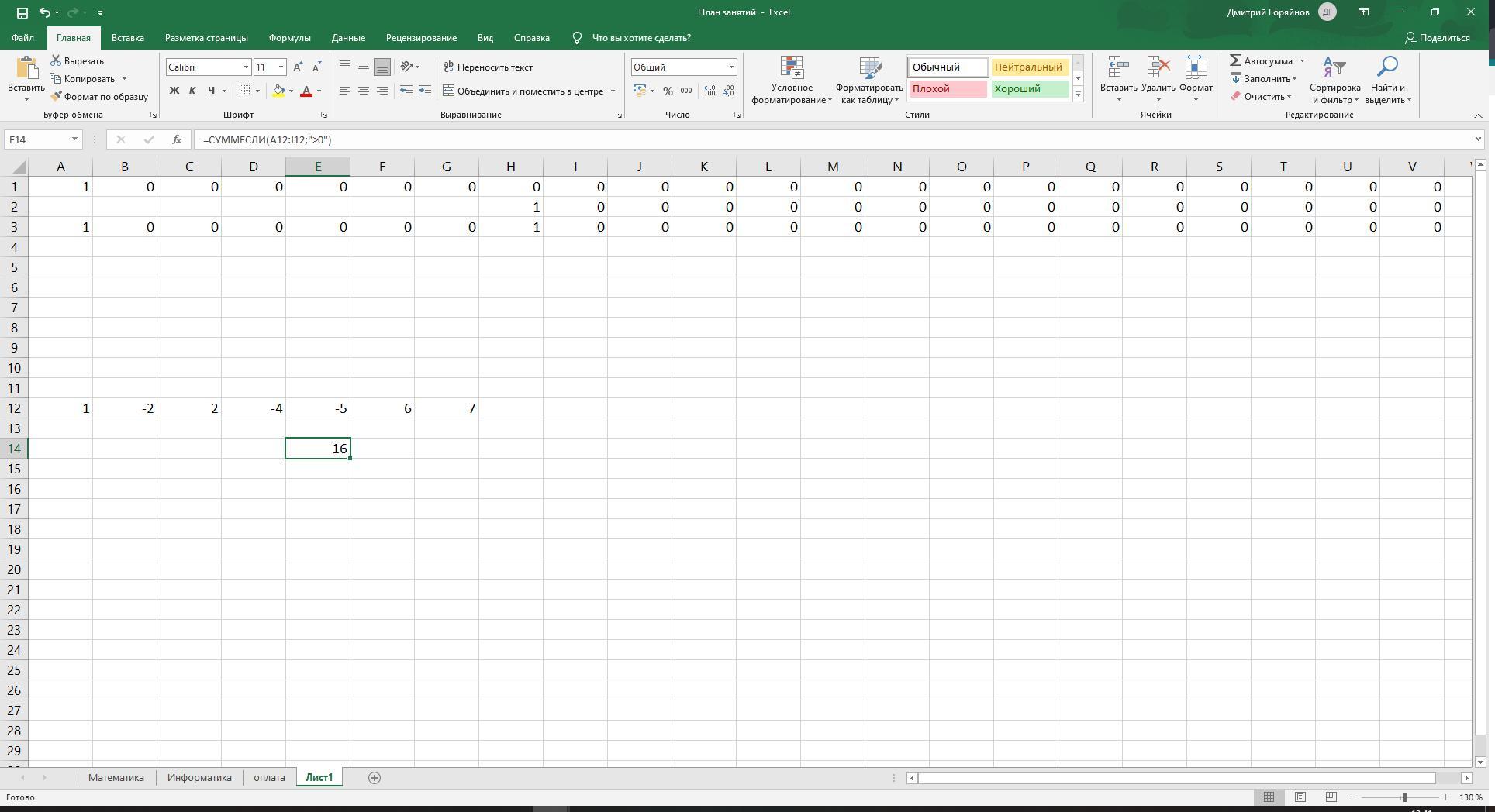 "На листе электронной таблицы Excel задайте произвольный массив чисел. Численные значения нужно задать самостоятельно. Предусмотрите наличие положительных и отрицательных чисел. Вычислите сумму положительных чисел и количество отрицательных чисел в этом массиве."