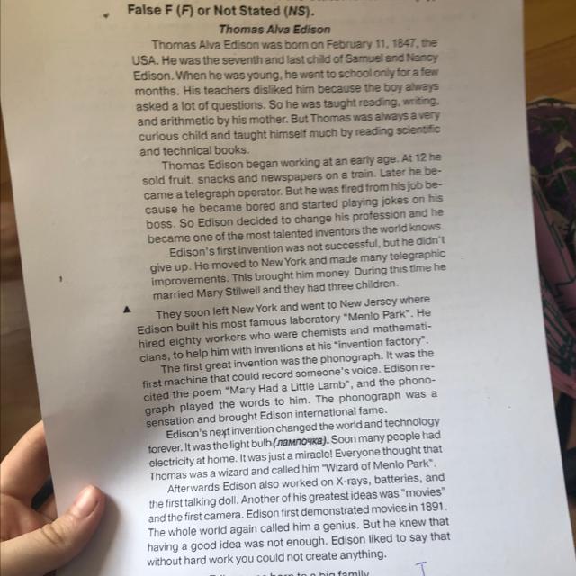1. Thomas Edison was born to a big family. 2. Thomas's teachers could not answer all his questions. 3. Thomas Edison was educated by his father. 4. Thomas Edison's first job was a telegrapher, 5. Thomas Edison worked with helpers in his lab. 6. The children played with the phonograph. 7. The light bulb was the most successful invention.