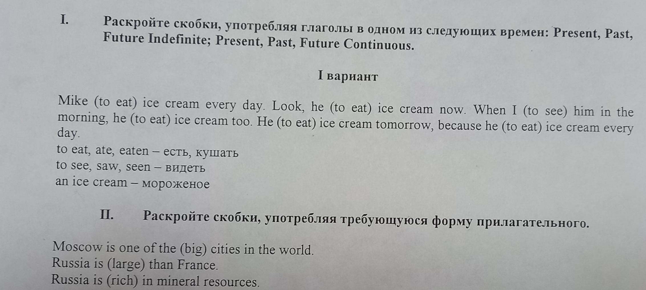 1)Mike eats ice cream every day. Look,he is eating ice cream now. When I saw him in the morning. he ate ice cream too. He will eat ice cream tomorrow, because he eats ice cream every day.