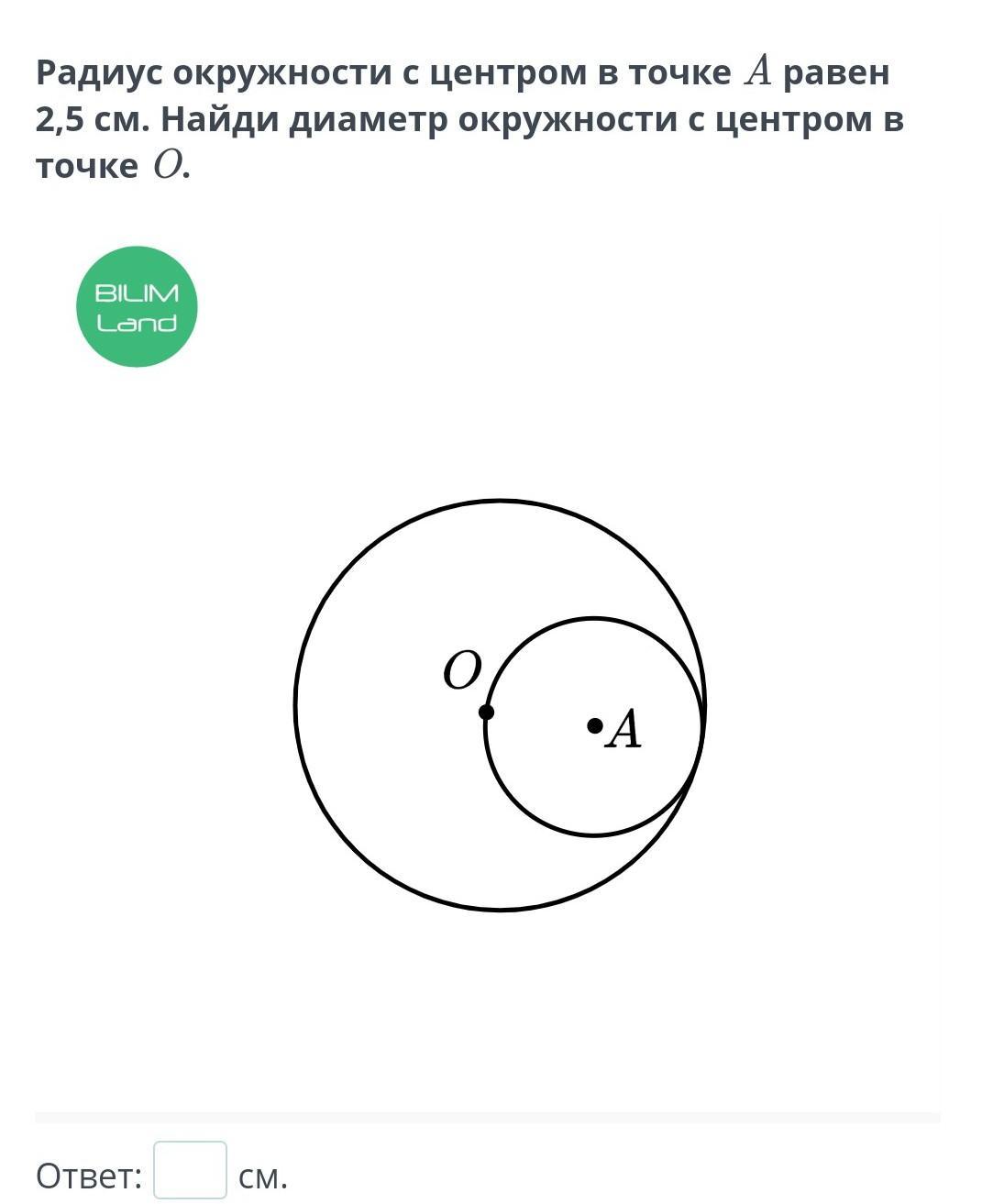Радиус окружности с центром в точке A равен 2,5 см. Найди диаметр окружности с центром в точке O.