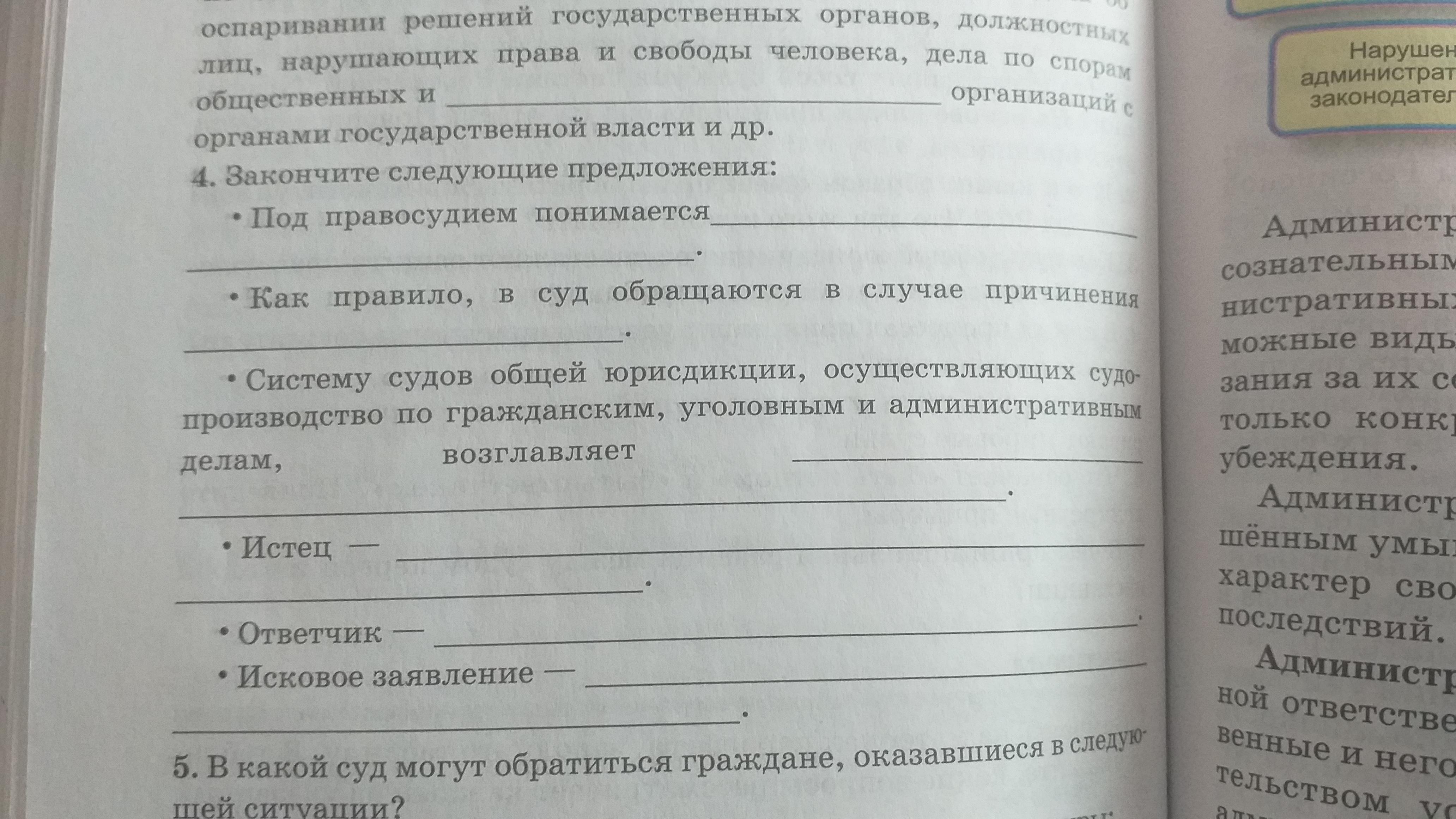 Верховный Суд Российской Федерации является высшим судебным органом по гражданским, уголовным, административным и иным делам, отнесенным к компетенции судов общей юрисдикции, осуществляет в предусмотренных федеральным законом процессуальных формах судебный надзор за их деятельностью и дает разъяснения по вопросам ...Истец - лицо, обратившееся в суд за защитой своих прав и интересов.Ответчик - лицо, привлекаемое к рассматриваемому в суде делу в связи с предъявленным ему истцом требованиемИсковое заявление - письменный документ, который потерпевший направляет в суд с целью защиты своих прав и интересов.