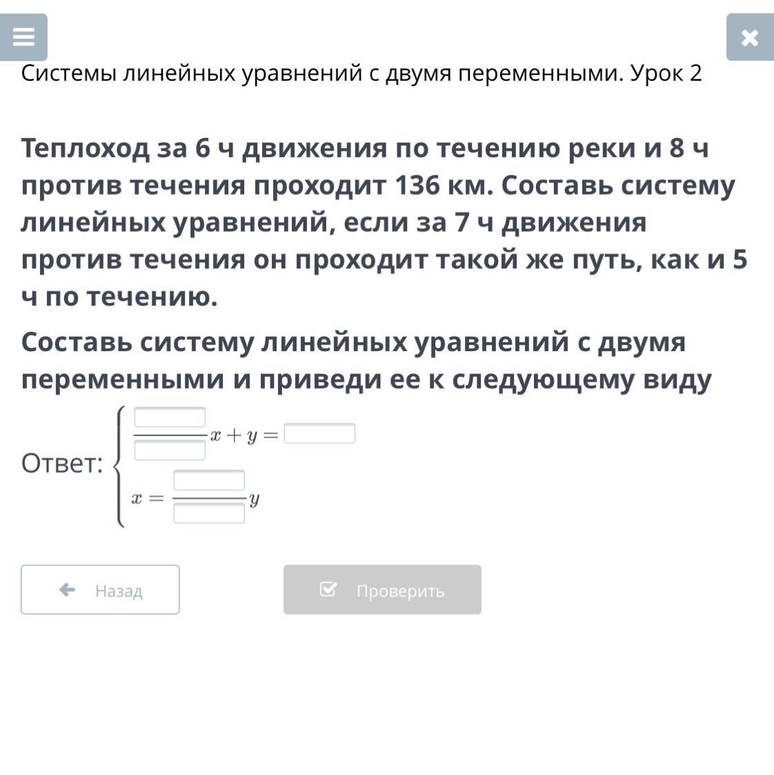 Теплоход за 6 ч движения по течению реки и 8 ч против течения проходит 136 км. Составь систему линейных уравнений, если за 7 ч движения против течения он проходит такой же путь, как и 5 ч по течению.