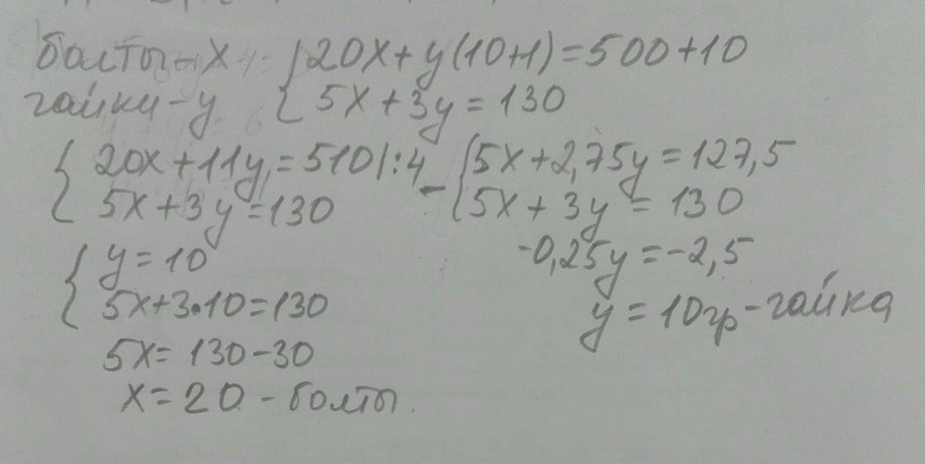 Масса 20 болтов и (10 + 1) гаек составляет (500 + 10) г, а масса 5 болтов и 3 гаек - 130 г. Какая масса болта и гайки?