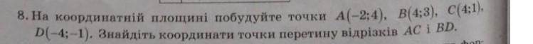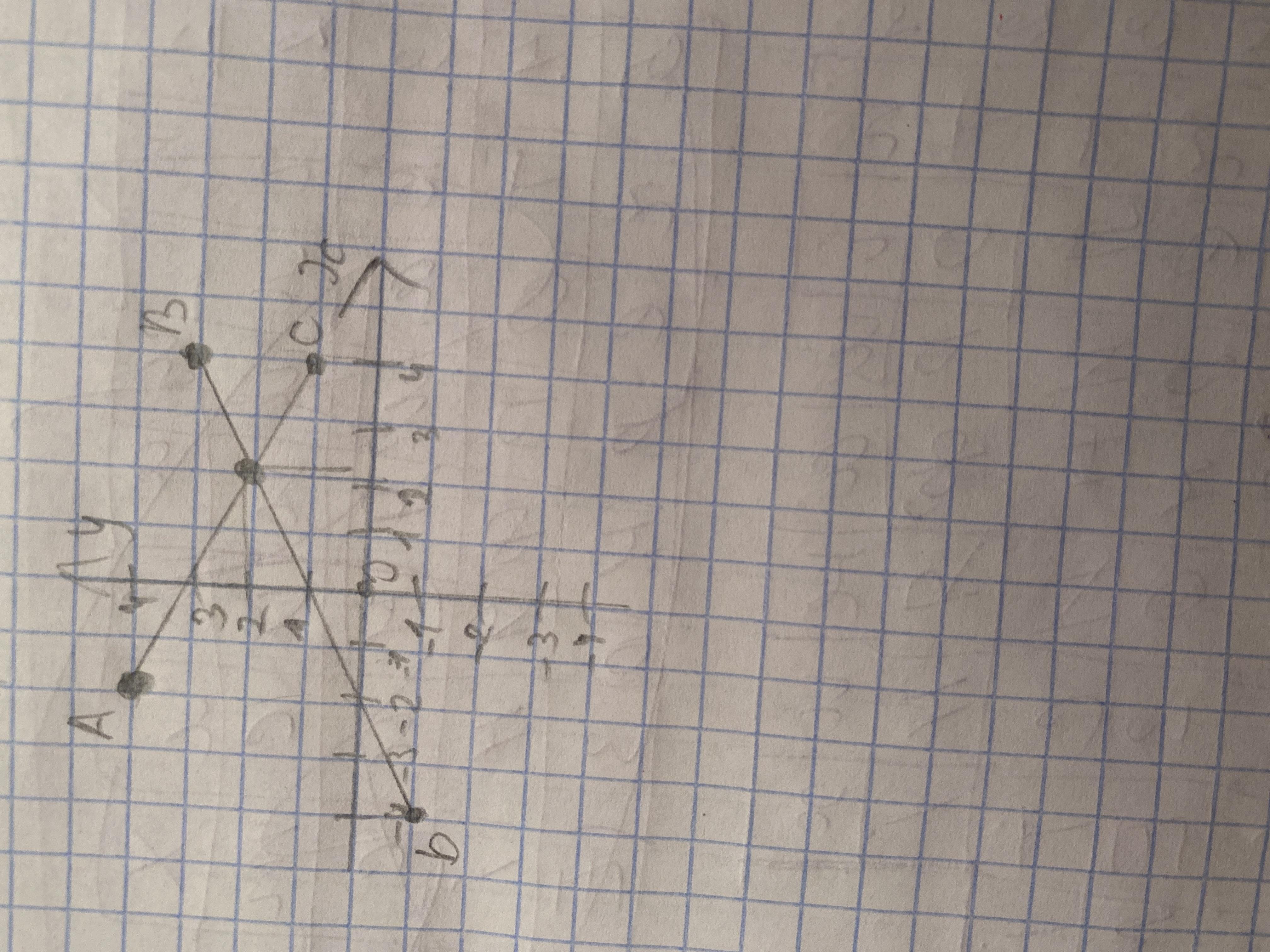 На координатній площині побудуйте точки А(-2;4), В(4;3), С(4;1), D(-4;-1). Знайдіть координати точки перетину відрізків АС і ВD. СРОЧНО!