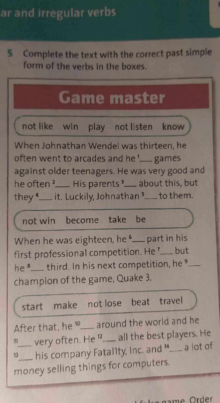 1.Play. 2.Win. 3.Know. 4.Not like . 5.Not listen. 6.Take. 7.Not win. 8.Be. 9.Become. 10.Travel. 11.Beat. 12.Not lose. 13.Start. 14.Make.