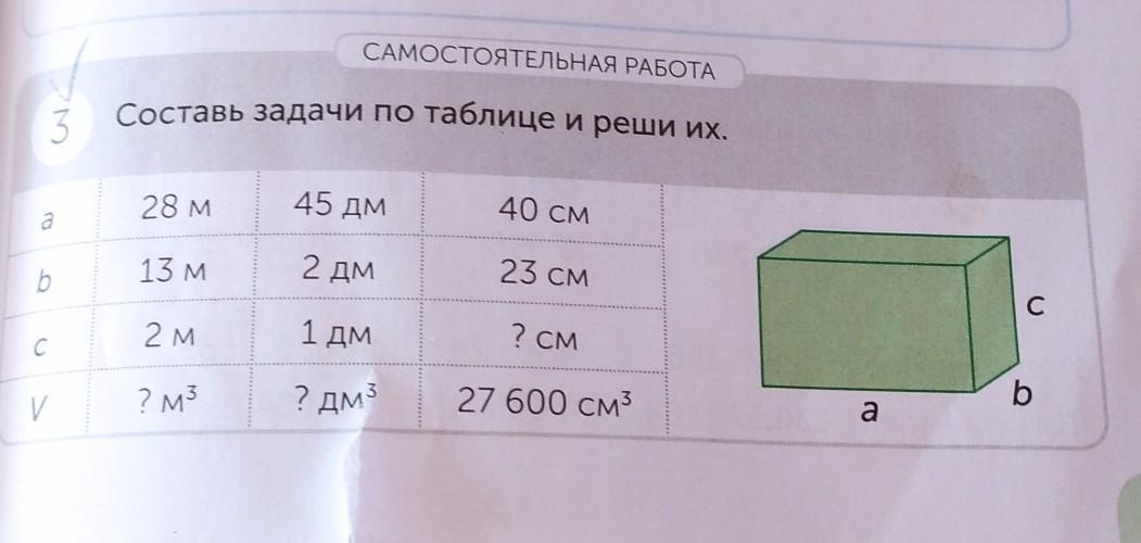3) c=V/(a*b)=27600/(40*23)=30 см