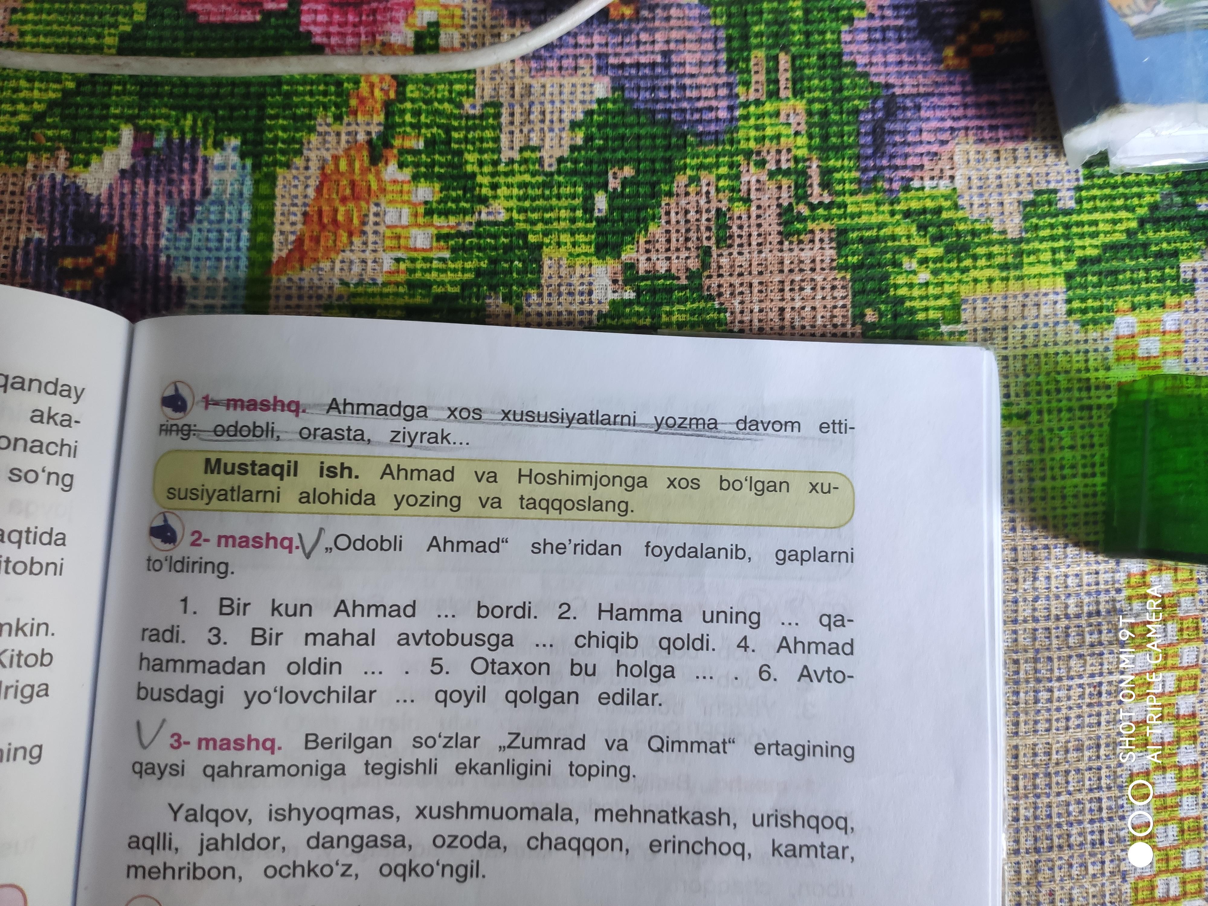 Помогите пожалуйста с узбекским языком нам нужно выполнить 2- Машк письменно . И ещё 3 - Машк тоже письменно . Очень надо пожалуйста