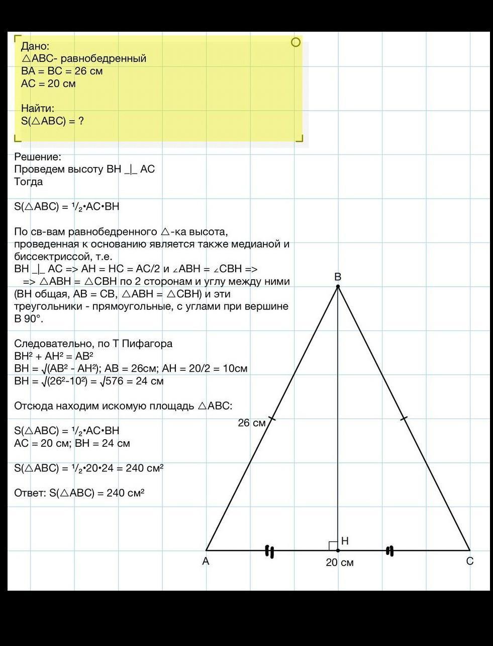 Боковая сторона равнобедренного треугольника 26 см, а его основа 20 см. Найти площадь треугольника.