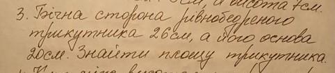 Бічна сторона рівнобедреного трикутника 26 см, а його основа 20 см. Знайти площу трикутника.
