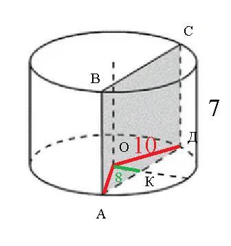 Высота цилиндра равна 7 см, радиус равен 10 см. Найдите площадь сечения цилиндра плоскостью, параллельной его оси, если расстояние между этой плоскостью и осью цилиндра равно 8 см.