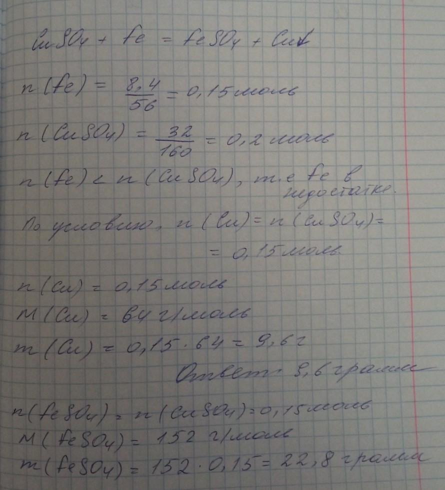 в раствор, содержащий 32 г медного сульфата, положили 8,4 г железного порошка. определите массу образующегося продукта