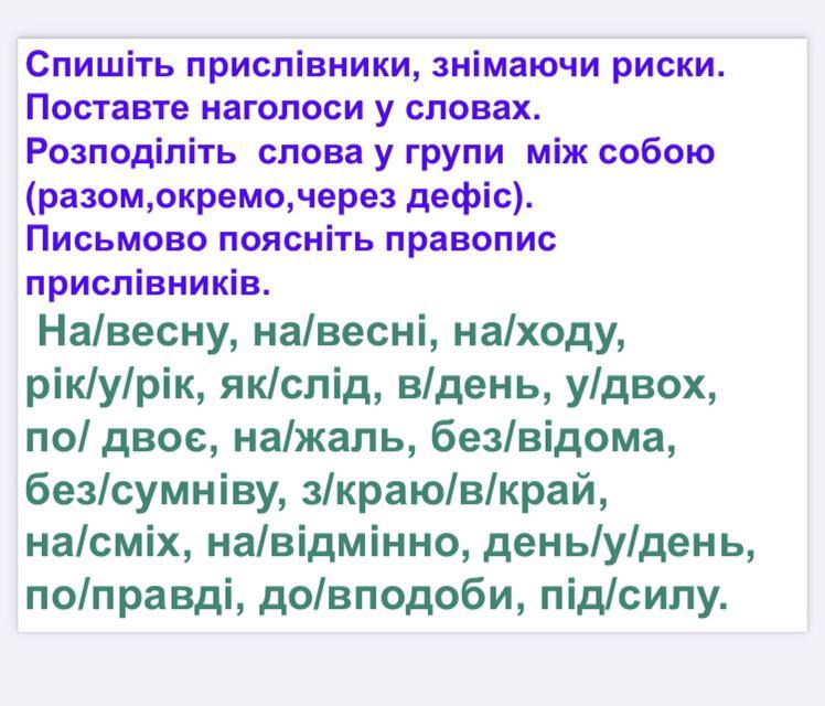 На весну,навесні,на ходу,рік-у-рік,як слід,вдень,удвох,по двоє,нажаль,без відома, без сумніву,зкраю-вкрай,насміх,навідмінно,день -у- день,по правді, довподоби,під силу