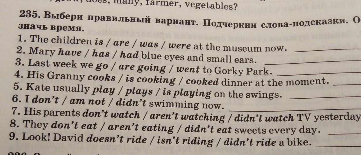 1 are 2 has 3 went 4 is cooking 5 plays 6 am not swimming 7 didnt watch 8 dont eat 9 isnt riding