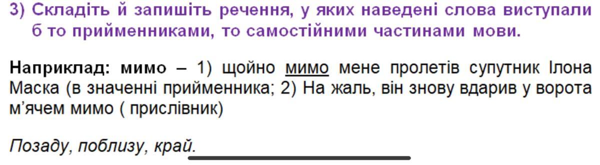 Я бачив усе, що діялося позаду (прийм.) мене. Мій товариш ледве йшов позаду (присл.). Поблизу (прийм.) річки розкинулося невеличке село. Десь поблизу (присл.) було чути шум моря. Край (прийм.) стола сиділи малі діти. Край (імен.) неба вже почав сіріти, світало.