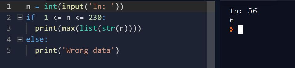 Т.к. нам нужна максимальная цифра, введем n и в списке, взятом от приведенного к строковому типу данных числа n найдем ту самую цифру с помощью встроенной функции max