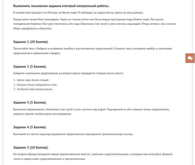 Ответ:1)Там росли молоденькие берёзки. Через их тонкие ветки мне была видна просторная гладь Белого моря. 2.Птица летела с юга ночами. 3.Огромные стаи гусей и уток неслись над водой.