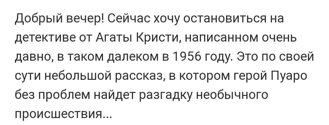 Добрий вечір! Зараз хочу зупинитися на детективі оТ Агати Крісті, написаному дуже давно, в такому далекому в 1956 році. Це по своїй суті невелике оповідання, в якому герой Пуаро без проблем знайде розгадку незвичайної події ...